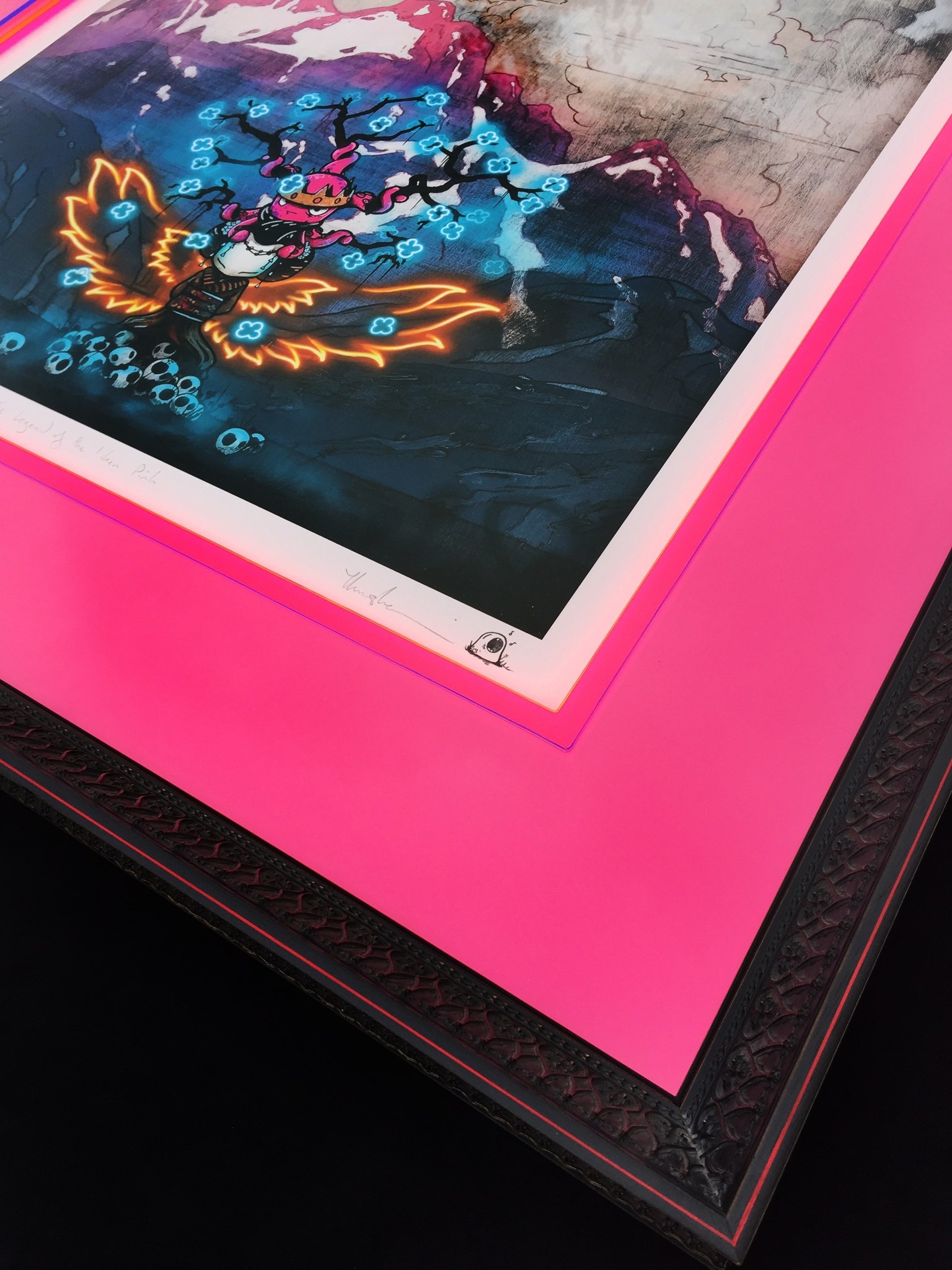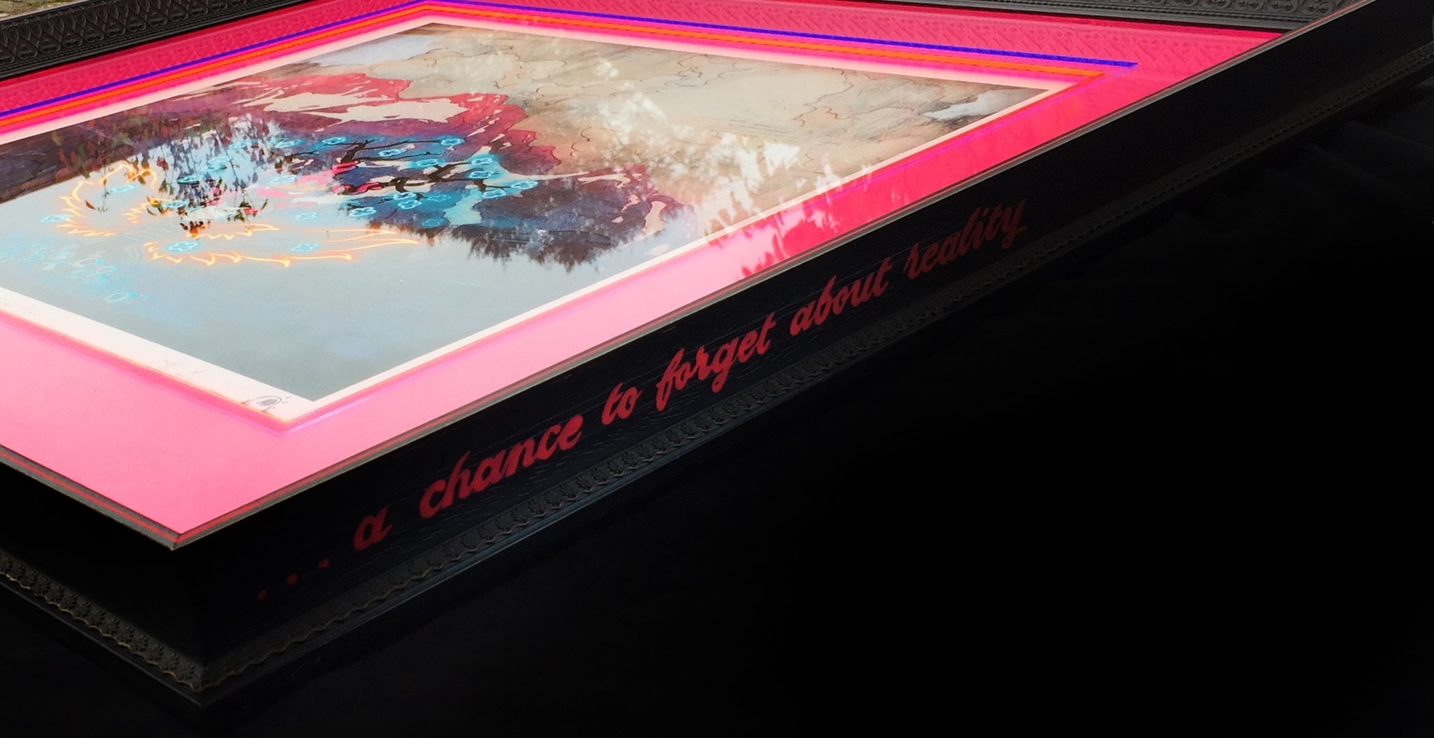 The mount board is made up of two pieces of fluorescent Perspex®, a blue fluorescent and pinkish fluorescent. For more information on our services please contact: This email address is being protected from spambots. You need JavaScript enabled to view it.